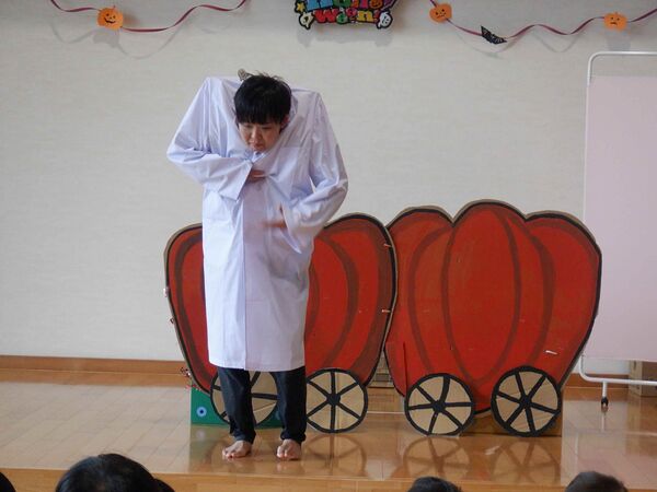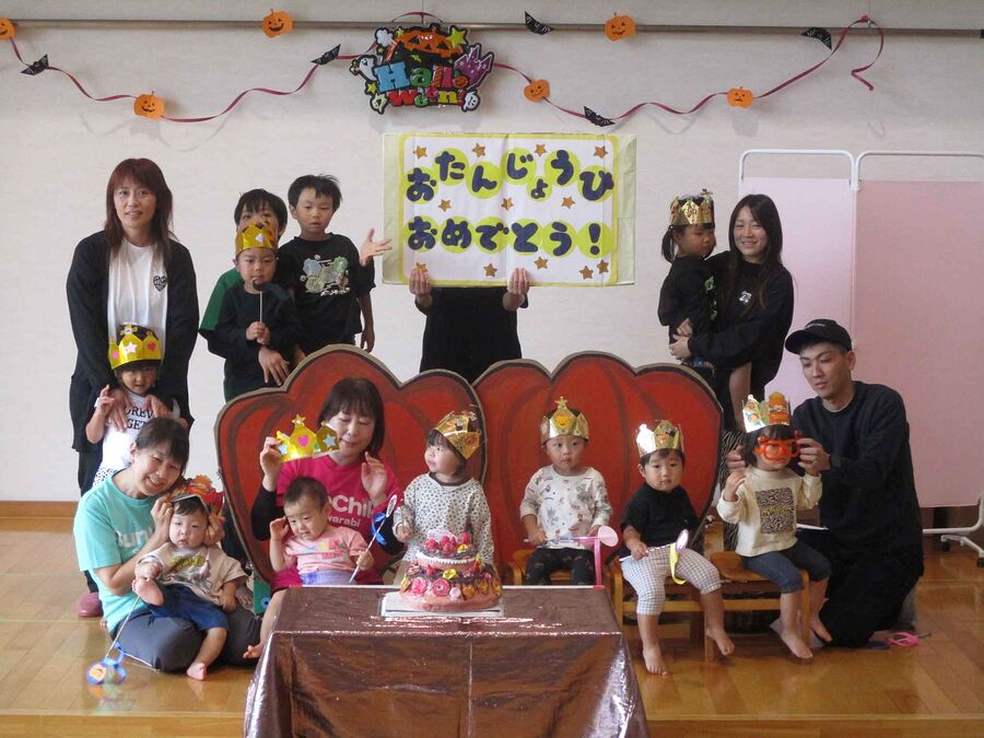 10月に生まれた10名のお友だちの誕生会をしました。もうすぐハロウィンがやってくるということで、大きなかぼちゃの馬車から誕生児が登場してきました。好きな食べ物や大きくなったらなりたいものを聞かれ、恥ずかしそうにしながら答える姿がかわいかったです💛