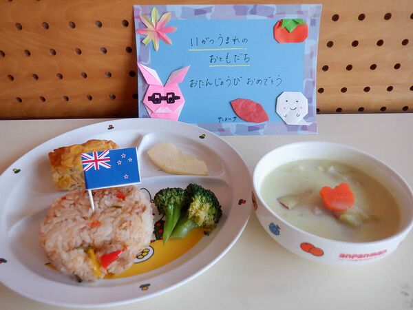今月の誕生会の「世界の料理」は、ニュージーランドのお料理でした。彩のきれいな料理に「おいしい!」と言って、お代わりをたくさんしていました。