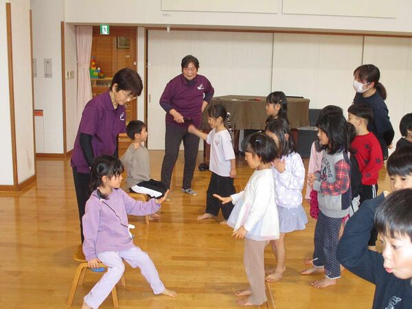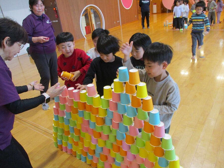 ジャンケンゲーや紙コップピンポン玉送りゲーム、紙コップを高く積んでみんなでピラミッドを作るなど、レクリエーション協会の方や友だちとふれあいながら、楽しく体を動かして遊びました。