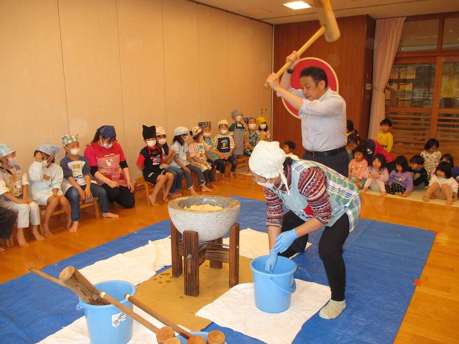 こどもたちの「ぺったん!ぺったん!」という元気な掛け声とともに、いいお餅がつきあがり、かわいらしい手で上手に丸めてくれました