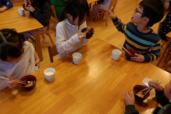 そして、鏡餅に誕生児さんが小槌を入れ、運を開いてくれました。法蔵寺さんからたくさんのお供え餅をいただき、ぜんざいにして午後のおやつに食べました。
