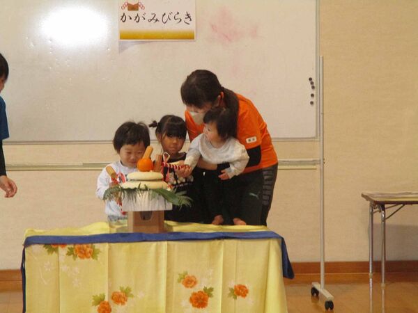 1月生まれの3名のお友だちの誕生会と鏡開きの会をしました。